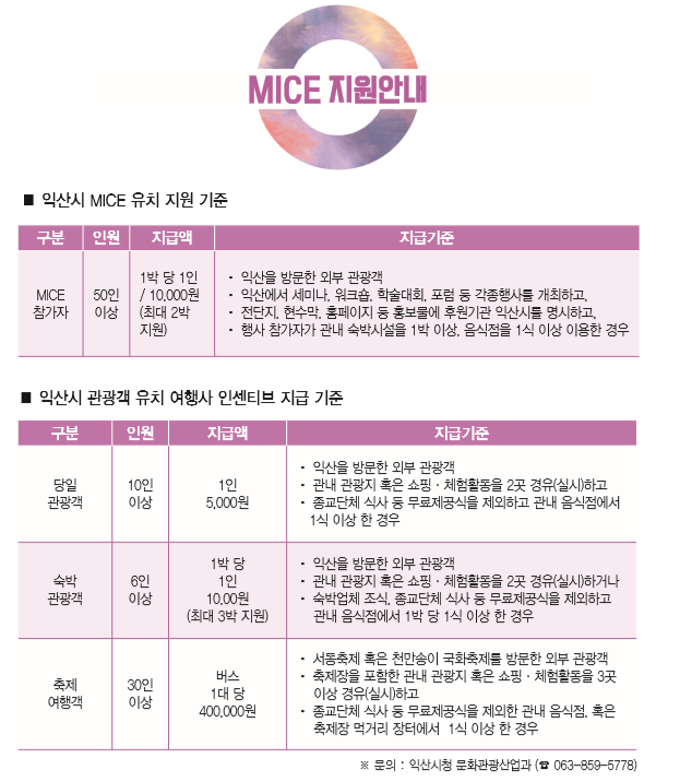 2019년 9월 16일 오전 익산시와 원광대학교 의과대학은 MICE 협약을 체결하였습니다. 의과대학이 익산시에 학회와 학술대회를 유치하면 익산시에 이를 지원하고 보존하는 형태입니다. 원광대학이 학회 유치를 통해 학술발전에 기여하며 동시에 익산의 관광자원을 활용하여 관광도시로서의 익산을 널리 알리는 것이 목적입니다. 원광대학교 의과대학(학장 오석규)은 다양한 의료 의학 학회를 익산에 더 많이 유치하도록 노려할 것이며, 다양한 익산의 문화자원이 국내외 많은 의학 연구자들에게 소개될 수 있도록 노력하겠다고 밝혔습니다.