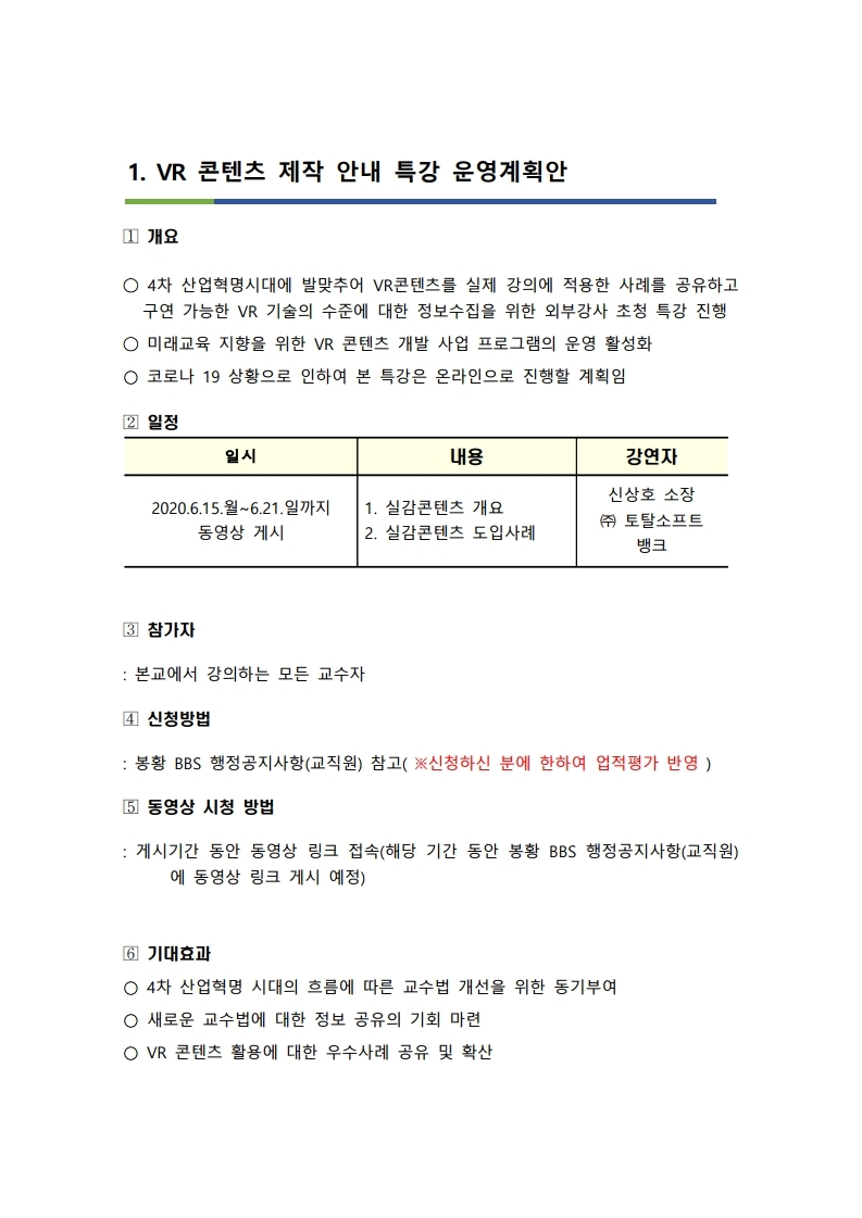 VR 콘텐츠 제작 안내 특강 운영 계획