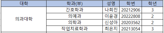 딘스리스트(DEAN’S LIST)는 성적이 우수하고 품행이 올바른 학생을 학장이 선정하여 격려하는 제도입니다. 선발된 모든 학생에게 축하의 말씀 전합니다. 1. 선정기준 – 본교 재학생(졸업예정, 졸업생, 휴학생 제외) – 직전학기 성적 최우수자로 학과의 추천을 받은 자 (학과(부)별 1명) – 직전학기 취득학점 15학점 이상인 자 2.딘스리스트(DEAN’S LIST) 선정자 혜택 – 딘스리스트 선발경력 학적부, 성적증명서 표기 – 단과대학 홈페이지 명단 게시 – 원광 아너스클럽(WK Honors Club) 가입(기념특강, 총장 명의 상장 및 기념품 증정 등) – 향후 프로그램 일정 학생 개별통보 예정 (문의: 교육혁신과(850-5756)) 3. 2023-2학기 딘스리스트(DEAN’S LIST) ![]() |