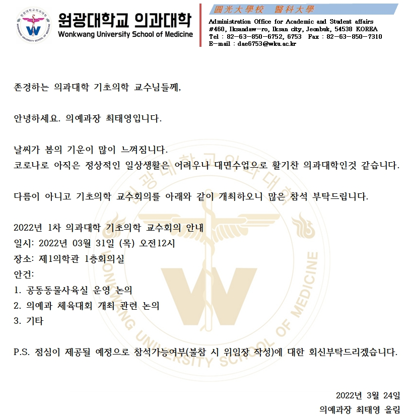 2022년 1차 의과대학 기초의학 교수회의 안내