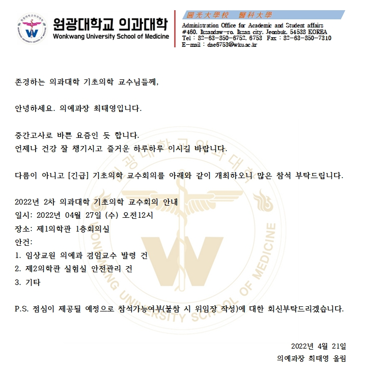 2022년 2차 의과대학 기초의학 교수회의 안내