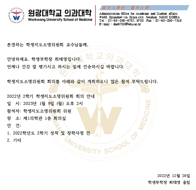 2022학년도 의예과 2학년 2학기 교과목 책임교수 회의 안내