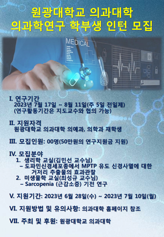 원광대학교 의과대학에서는 우수한 의예과/의학과 학부생들에게 최신 의과학 분야를 소개하고 관련 연구를 수행하게 함으로써 4차산업 시대를 이끌어갈 우수한 전문의료인 양성을 목표로 하고 있습니다.