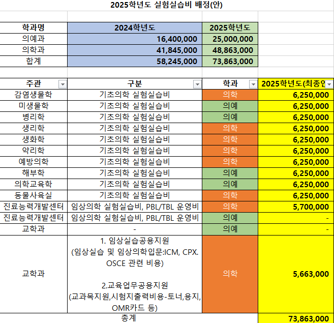 2025학년도 의과대학 실험실습비 운용계획