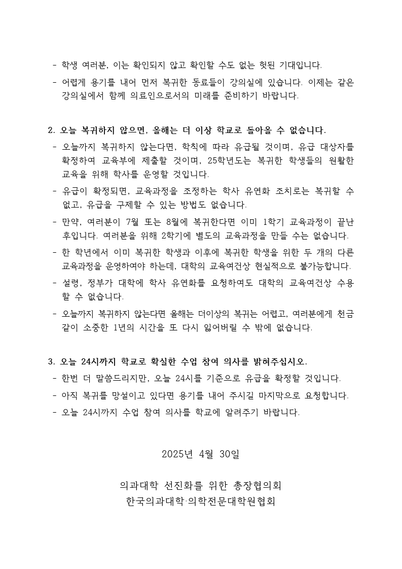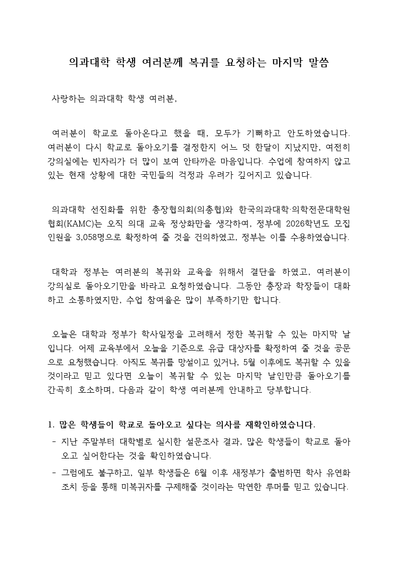 [교육부] 의과대학 학생 여러분께 복귀를 요청하는 마지막 말씀