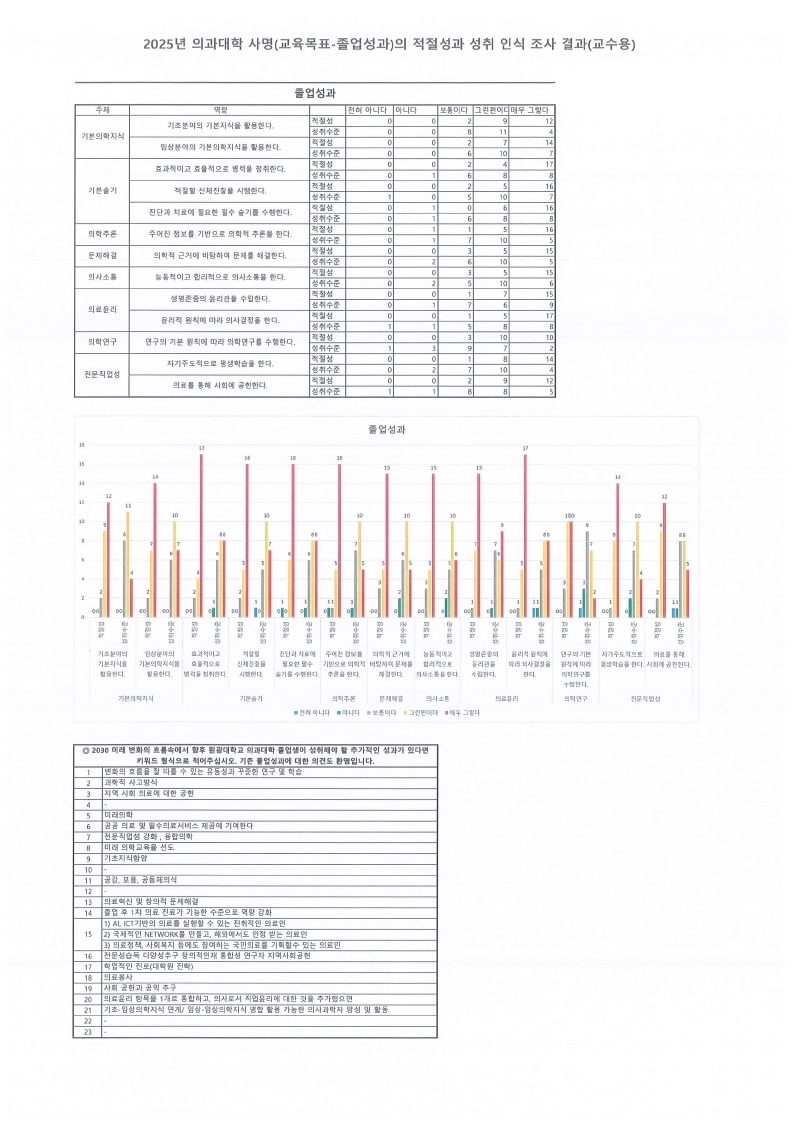 [의과대학 사명(교육목표-졸업성과)의 적절성과 성취인식 조사 결과]