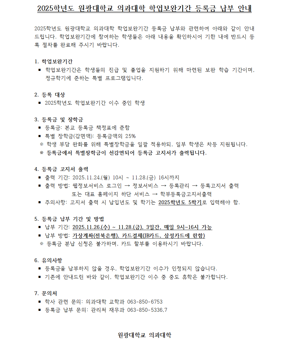 2025학년도 원광대학교 의과대학 학업보완기간 등록금 납부 안내