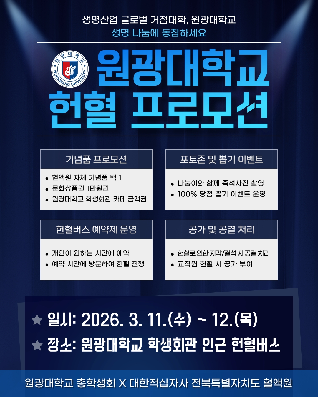 헌혈을 통한 생명 나눔에 원광대학교가 동참하고자 헌혈 행사를 진행하오니 적극적인 참여를 바랍니다.