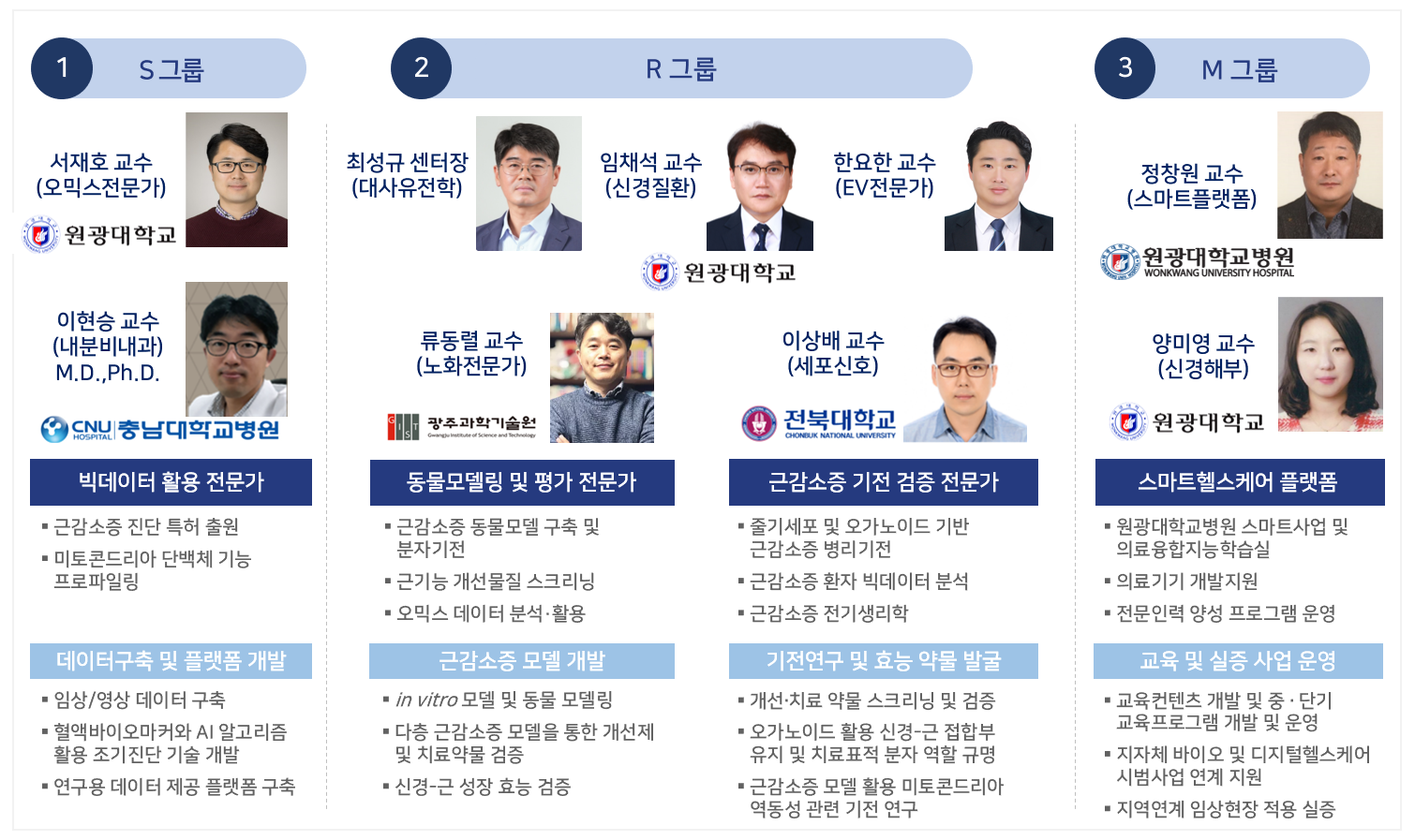 본 센터를 통해 대학 연구경쟁력 강화 및 호남지역 연구기관의 공동연구 활성화를 비롯해 기술 경쟁력 확보와 기업 경쟁력 강화에 나섬으로써 대학의 연구역량 강화 및 지역 경제 활성화에도 도움이 될 것으로 기대하고 있습니다. 특히, 다중 융합연구를 통한 근감소증의 통합적인 이해와 진단 표준 제시, 근감소증 조기진단과 예방 솔루션 제공 및 근감소증 개선제 / 치료제 개발로 지역사회 고위험 노인환자 안심 체계 구축에 기여하고 있습니다.
