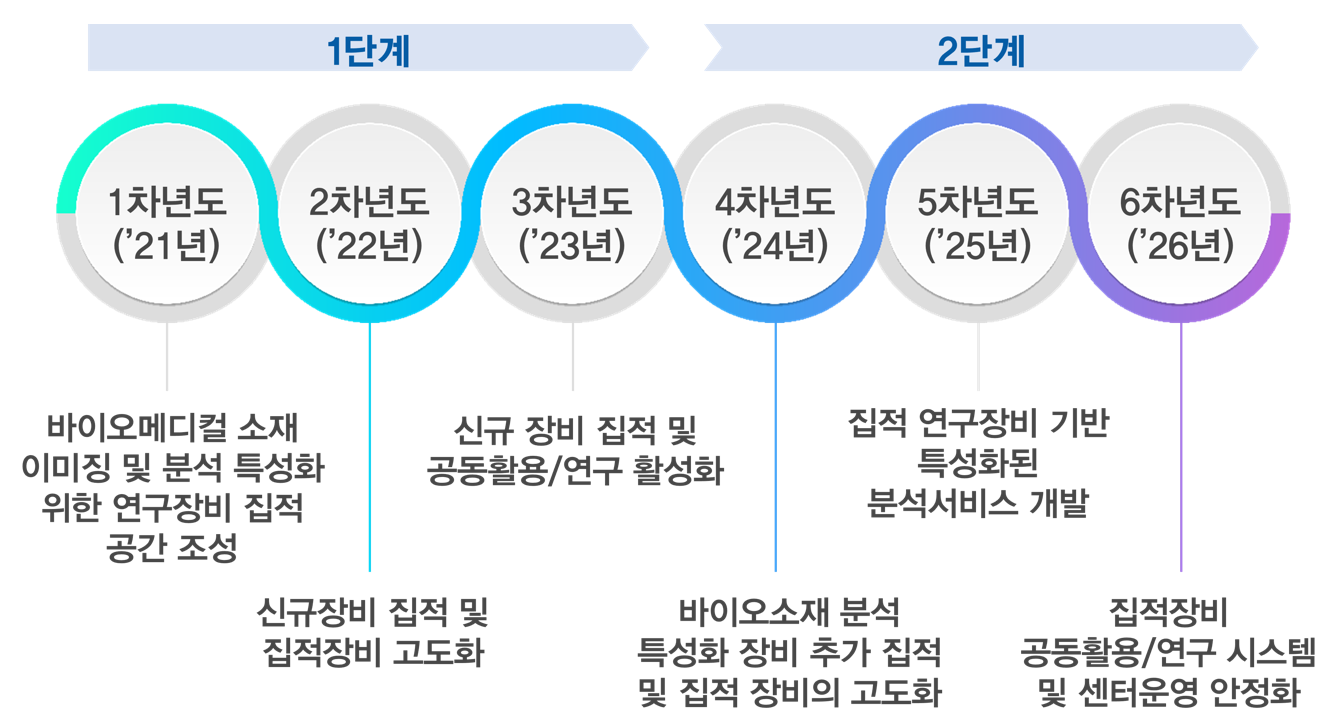 호남권 의약학분야 특화 바이오메디컬 소재 분석 및 이미징 센터 구축 및 자립을 목표로 2021년 교육부 기초과학연구역량강화사업에 선정되어 생체친화의료소재 개발 및 재생의료 응용 연구를 위한 핵심연구지원센터로서, 실효적인 연구장비 집적을 통해 전라북도 혁신성장전략에 대응하고 연구장비 공동활용 강화 및 바이오메디컬 소재분석‧이미징 공동연구육성을 위한 지원 체계를 구축해 오고 있습니다.